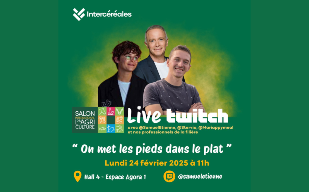 Pour la première fois, le Salon International de l’Agriculture accueillera un plateau Twitch en live, une initiative inédite portée par la filière céréalière française. Intercéréales invite l’un des streamers français les plus influents à s’emparer des questions agricoles. Le journaliste et streamer Samuel Étienne, accompagné de Mariappymeal et de Stervio, animera un live de plus de deux heures aux côtés de professionnels de la filière céréalière. Objectif : discuter de tous les sujets, sans tabou !