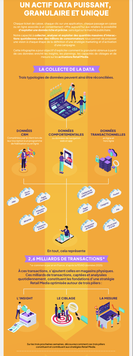 L’infographie s’articule autour de trois piliers majeurs de la data : Les insights : une analyse approfondie des tendances de consommation et du marché, permettant aux annonceurs d’orienter leurs stratégies avec justesse. Le ciblage : une activation des données qui permet d’atteindre les audiences les plus fines en fonction de signaux consommateurs précis. La mesure : une méthodologie analytique avancée garantissant un suivi détaillé et une attribution transparente des performances publicitaires.