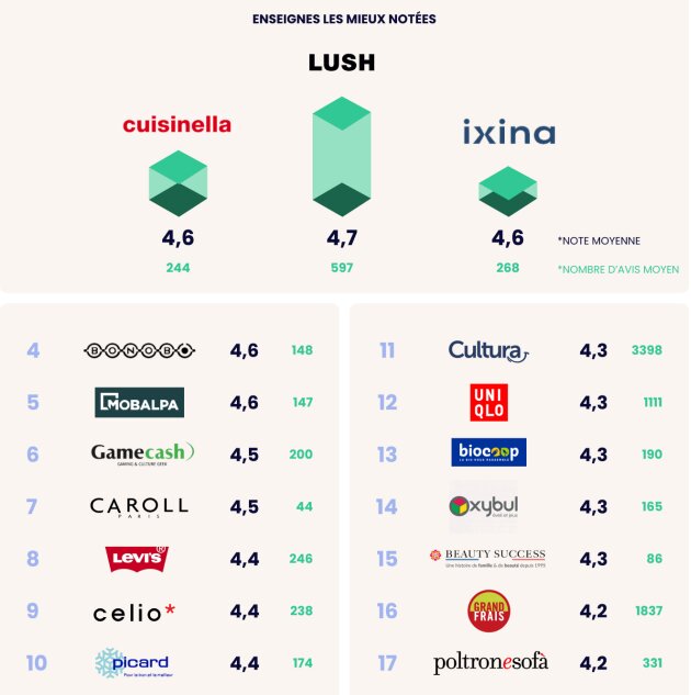 L’e-réputation joue un rôle clé dans la décision d’achat. Les enseignes du retail affichent en moyenne une note de 4,1 sur 5 sur leur fiche d’établissement Google. Certaines se distinguent, comme Lush, qui obtient une note de 4,7, suivie de Cuisinella et Ixina. À l’inverse, d’autres affichent des scores bien inférieurs, descendant jusqu’à 3,3, ce qui peut affecter leur attractivité.