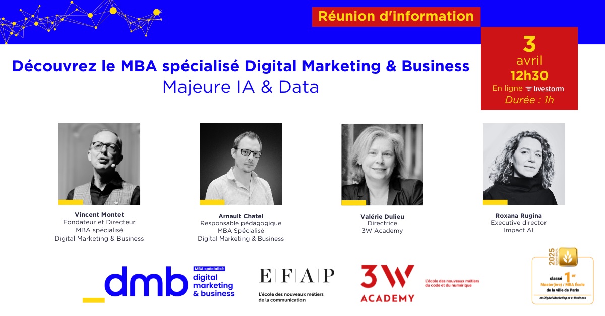 Comment se former pour acquérir les compétences attendues par les recruteurs dans ce domaine qui recrute ? Quelles sont les opportunités de carrière qui vous sont offertes, et comment parvenir à vous démarquer de la concurrence ? Pour répondre à toutes ces questions et vous guider dans la réussite de votre projet professionnel, le MBA spécialisé Digital Marketing & Business (MBADMB) de l’EFAP organise en avril plusieurs sessions thématisées.