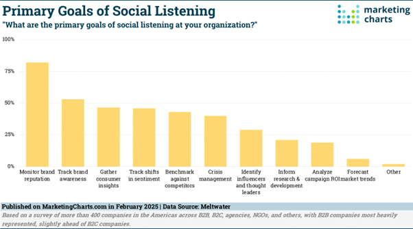Tout d’abord, rappelons ce qu’est le Social Listening ; il s’agit d’observer et décrypter ce qui se dit en ligne sur les médias sociaux, les blogs, les forums, les podcasts, sur l’ensemble du web en somme. Tout ceci avec une intention des plus claires&nbsp: capter l’avis des consommateurs instantanément et ajuster ses stratégies marketing en fonction. L’écoute sociale peut être utilisée aussi pour monitorer l’e-réputation, suivre la notoriété de sa marque, collecter des insights consommateurs. Analyser le sentiment, et identifier les leaders d’opinion sont aussi des objectifs et des utilisations d’entreprises, comme le souligne cette étude de Marketing Charts