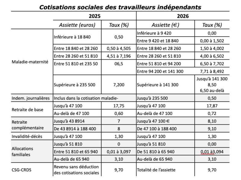 En 2025, les cotisations et contributions sociales restent calculées sur la même assiette qu’en 2024, avec les mêmes taux. Les nouveaux taux de cotisations et la nouvelle assiette seront appliqués en avril/mai 2026 lors de la régularisation des cotisations de l’exercice 2025, une fois connus les revenus de 2025.  Sous réserve d’éventuels ajustements, le barème des cotisations est le suivant.