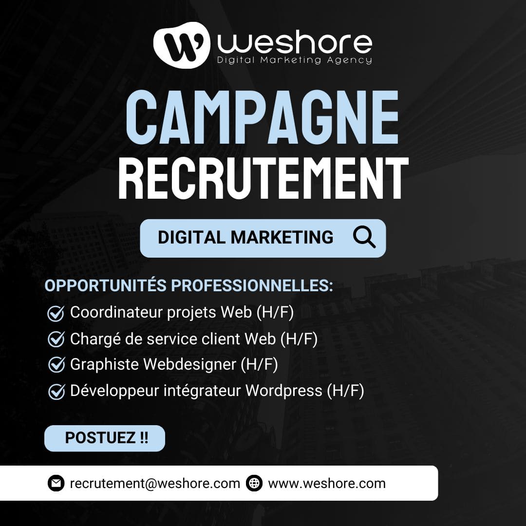 Weshore, agence de marketing digital basée à Marrakech, lance une campagne de recrutement pour plusieurs postes clés dans l’univers du digital. Ces opportunités s’adressent aux professionnels passionnés par le web et le design, souhaitant intégrer une structure en pleine croissance au cœur de l’écosystème numérique.
