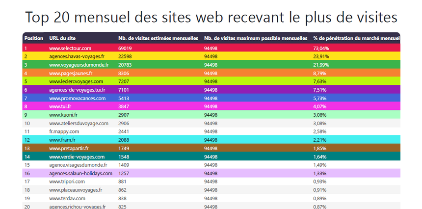 Par exemple, Selectour domine largement avec environ 68 067 visites mensuelles et une pénétration de marché de 72 %, suivi par Voyageurs du Monde (22 %) et Havas Voyages (17 %). Ces chiffres révèlent la concentration du trafic SEO sur quelques acteurs dominants.