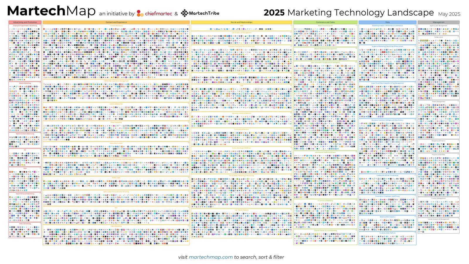 Le « Marketing Technology Landscape 2025 » co-produit par Scott Brinker (Chief Martech) et Frans Riemersma (MartechTribe) ne cesse de s’étoffer. Depuis sa première édition en 2011 — qui comptait 150 solutions — la cartographie est devenue un monstre graphique, devenu illisible dans sa version imprimée, mais accessible en version interactive via MartechMap.com.