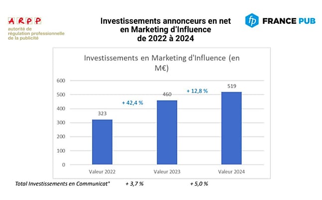 Le marketing d’influence continue son ascension en France. C’est ce que révèle la première étude conjointe de l’ARPP (Autorité de Régulation Professionnelle de la Publicité) et de France Pub, présentée en conférence de presse ce mardi 13 mai et consacrée aux investissements des annonceurs – nationaux comme locaux – dans ce levier devenu stratégique. En 2024, le secteur franchit un cap symbolique avec 519 millions d’euros investis, marquant une progression de 12,8 % par rapport à 2023, et de 42,4 % depuis 2022. Une dynamique qui dépasse largement celle des investissements en communication globale.