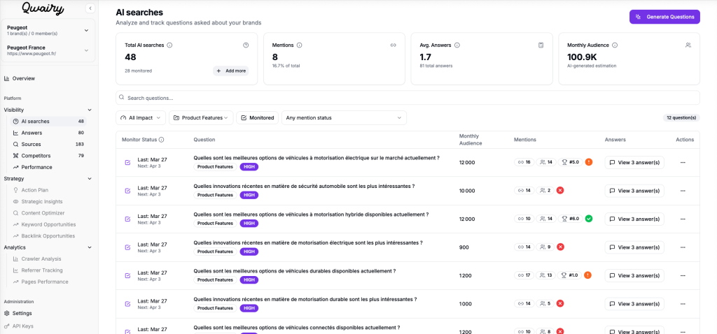 Parmi les nouveaux venus sur ce terrain, Qwairy mérite qu’on s’y attarde. Développée en France par Luca Fancello (connu pour le podcast SEO Position 0 et auteur d’une formation sur le SEO programmatique chez FormaSEO), Nicolas Ihle et Aimé Dushimire, la plateforme s’attaque à un problème bien identifié : donner aux marques une vraie vision de leur visibilité dans les réponses générées par les IA.