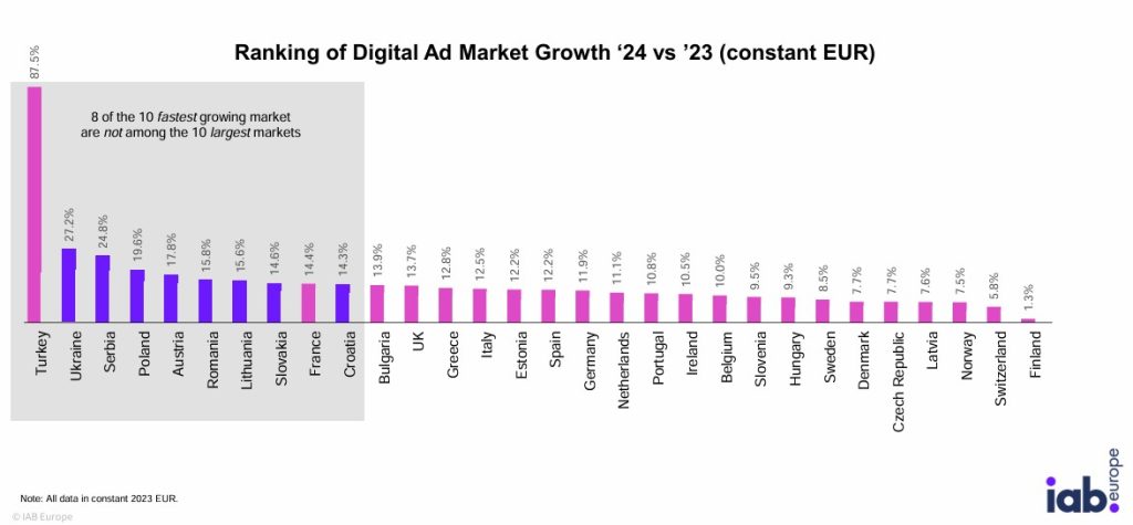 2024 a été une année record, avec 21 des 30 marchés analysés dans l’étude qui ont connu une croissance à deux chiffres. Le Royaume-Uni, premier marché européen avec un volume de presque 42 milliards d’euros, continue de connaître une bonne croissance (+ 14 %), soutenu par un écosystème digital déjà mature. Parmi les marchés émergents, l’étude met en avant l’Ukraine (+ 27,2 %) et la Serbie (+ 24,8 %), ce qui témoigne d’une confiance croissante des annonceurs à l’égard des petits marchés. En effet, huit des dix pays les plus dynamiques ne font pas partie des dix plus grands marchés. Pour sa part, la France se situe en neuvième position (+ 14,4 %).