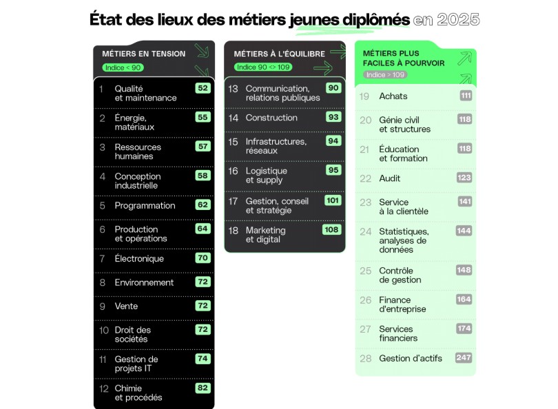 Ainsi, à la 1ere place des profils juniors les plus difficiles à recruter, se trouvent les professions liées à la qualité et à la maintenance. Dans le classement des autres spécialités pénuriques en début de carrière, les ingénieurs en conception des systèmes industriels se placent au 4e rang (derrière l’énergie et les RH) suivis par les programmeurs. Les chefs de projets IT arrivent à la 11e place du baromètre. Du côté des métiers à l’équilibre concernant les jeunes candidats du marché de l’emploi ceux des infrastructures et des réseaux, de la logistique/supply chain ainsi que du marketing digital sont cités.