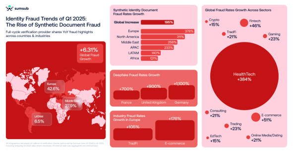 Source : Tous les chiffres référencés sont basés sur les statistiques propriétaires de Sumsub, tirées de millions de contrôles de vérification d’identité effectués dans le monde entier entre le 1er trimestre 2024 et le 1er trimestre 2025.