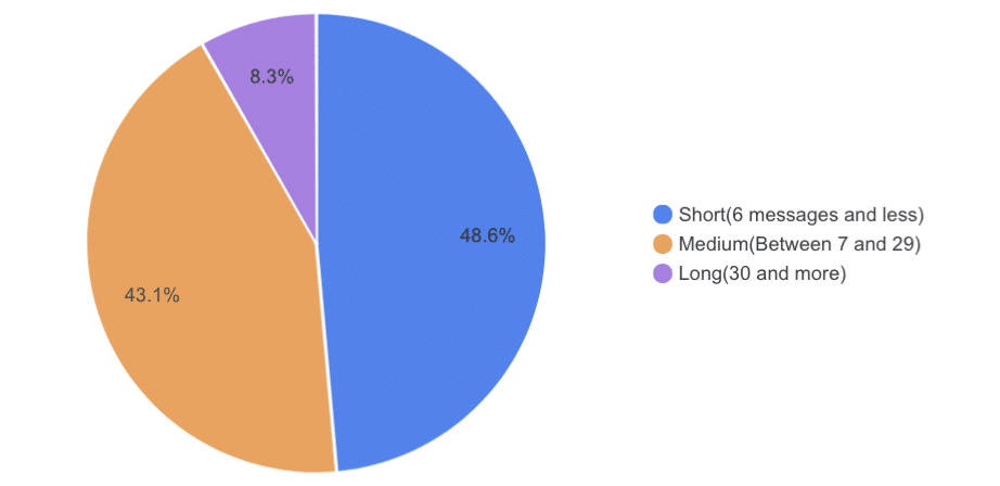 - Des conversations prolongées : 60 % des discussions comprennent au moins 5 échanges, et plus d’un tiers (35 %) dépassent les 8 messages. La recherche devient fluide et évolutive au fil des réponses.