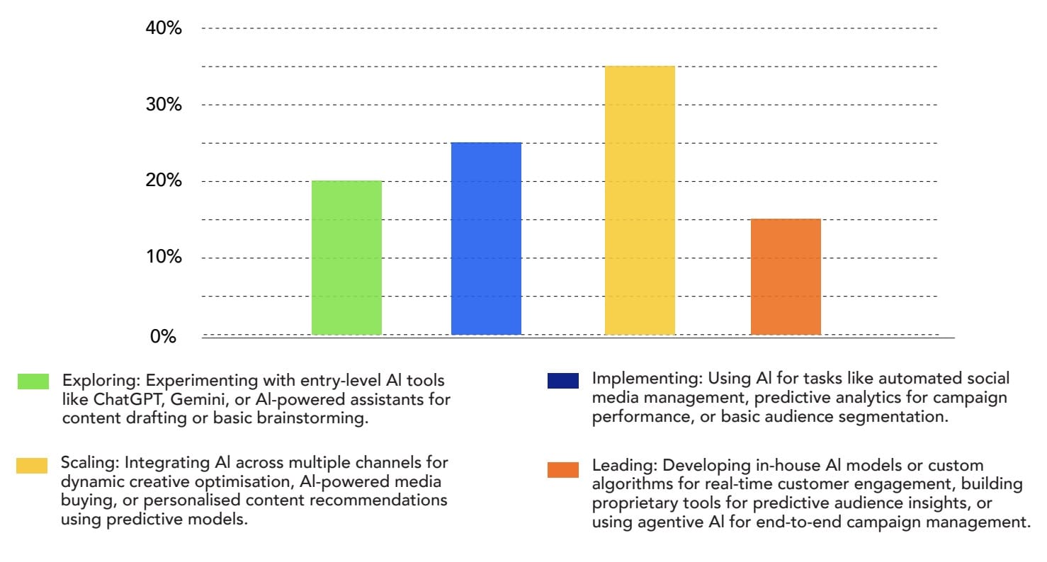Selon Epsilon, 33% des personnes interrogées se situe dans une phase de montée en puissance, où l’IA est intégrée à plusieurs canaux, notamment pour l’achat média ou la personnalisation de contenus.