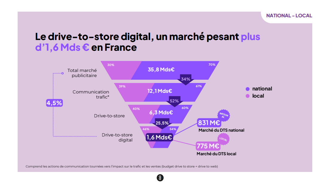 Dans ce total, les investissements digitaux ayant vocation à générer du trafic en point de vente représentent 1,6 milliard d’euros. Le drive-to-store digital pèse ainsi près de 25% des investissements drive-to-store et 4,5% du marché publicitaire français total.