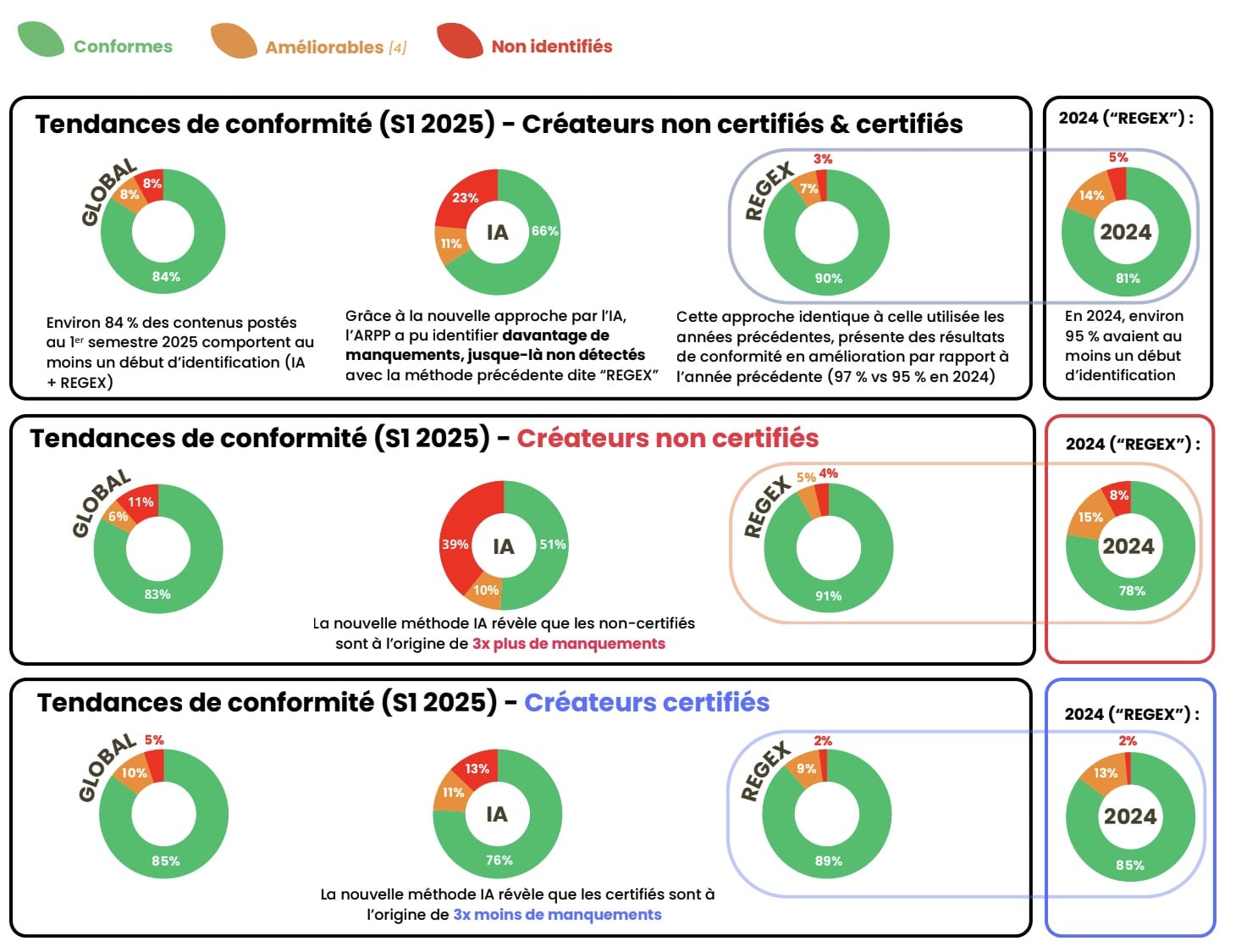 Au premier semestre 2025, 194 000 contenus ont été examinés, contre un peu plus de 60 000 sur toute l’année précédente. Sur cette période de l’année, 9 810 collaborations commerciales ont été identifiées et évaluées par les experts de l’ARPP, pour un taux global de conformité de 84%.