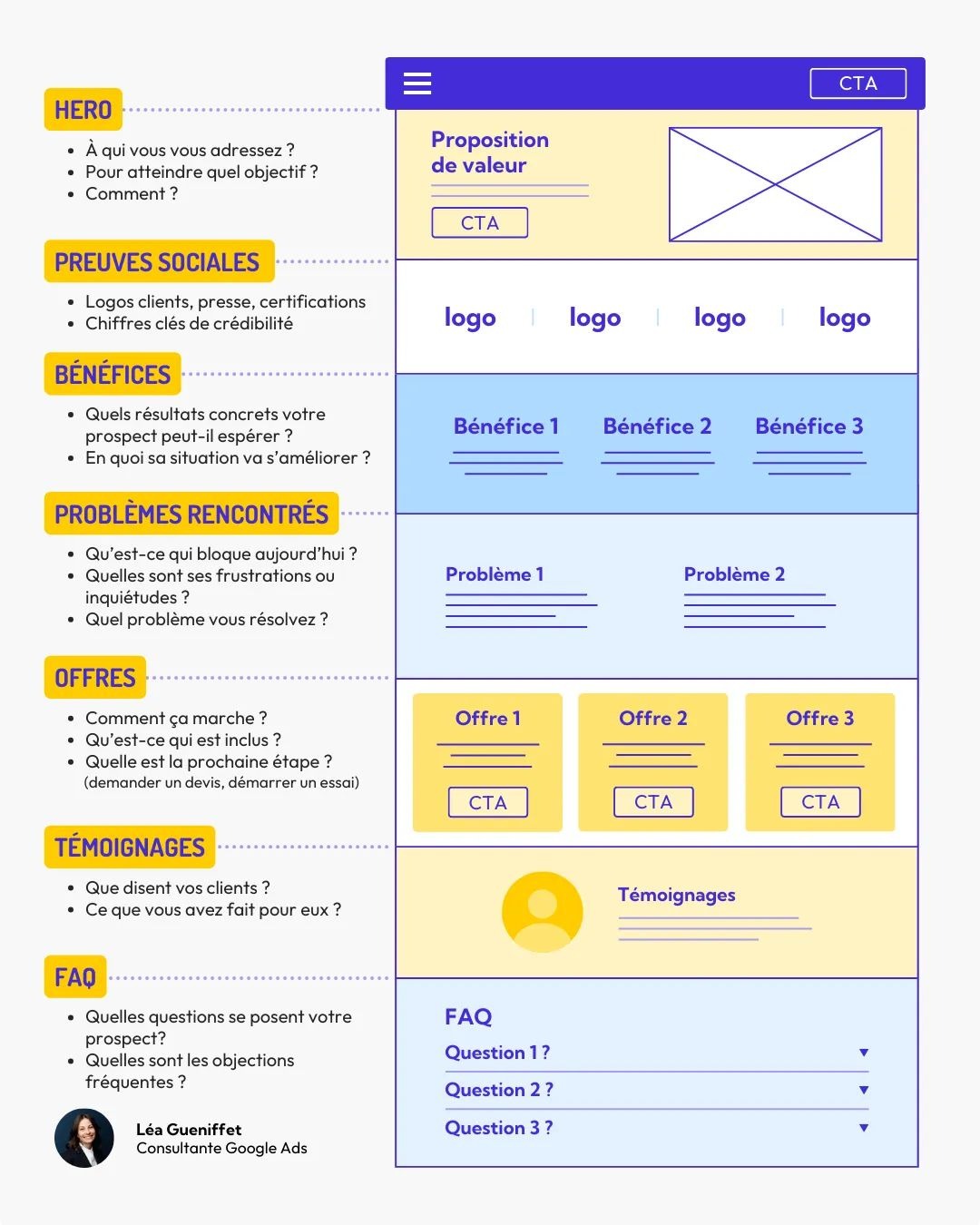 Si vous souhaitez soigner votre landing page, vous pouvez vous appuyer sur le modèle conçu par Léa Gueniffet, qui découpe la page en 7 blocs.