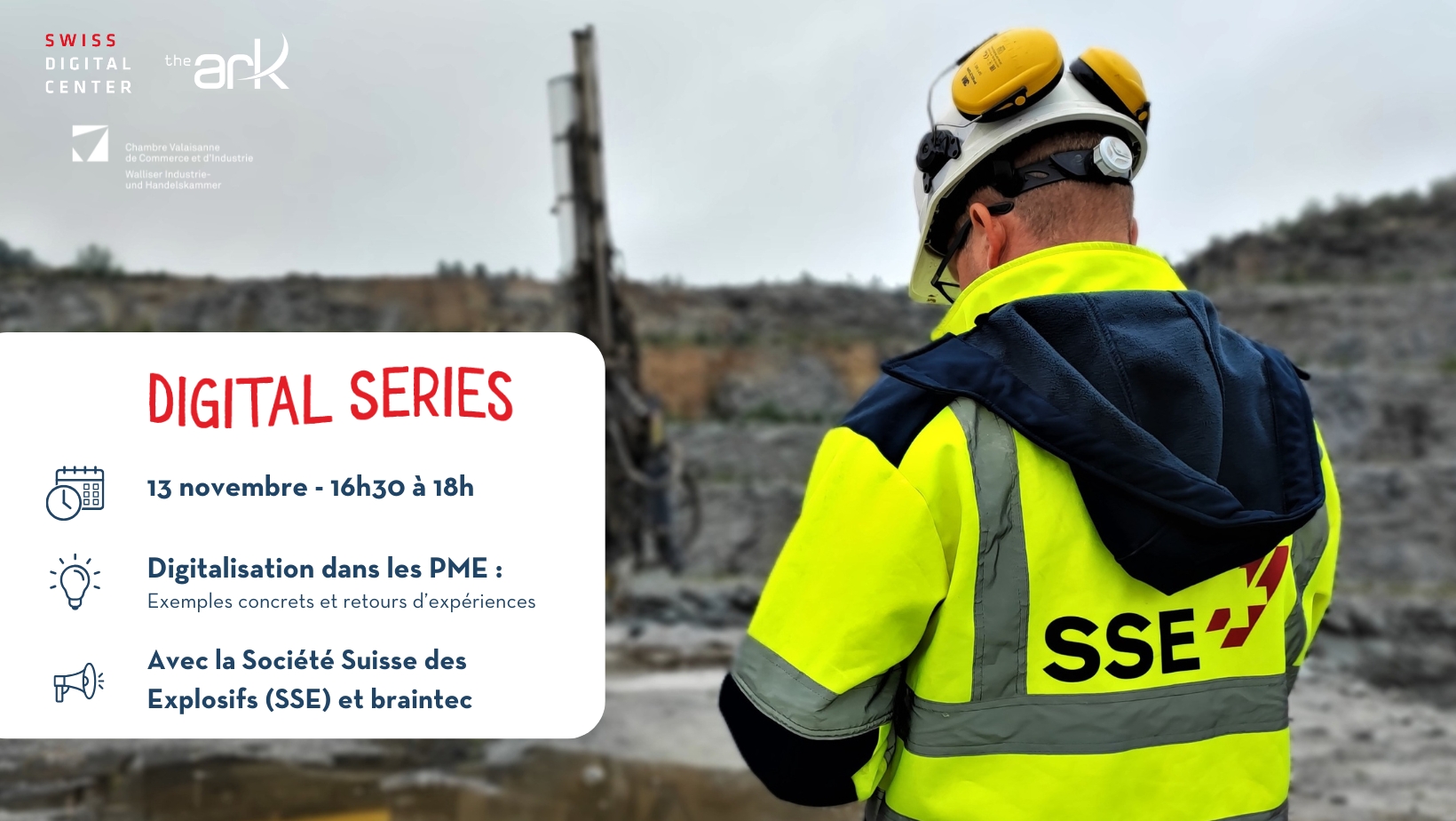 Le Swiss Digital Center, la Fondation The Ark et leur partenaire la Chambre Valaisanne de Commerce et d’Industrie, organisent la 9ᵉ édition des « Digital Series » le jeudi 13 novembre 2025 à Gamsen, au siège de la Société Suisse des Explosifs (SSE). Cette série d’évènements a pour but de présenter des exemples concrets et des outils de digitalisation qui permettent d’augmenter la productivité des PME.