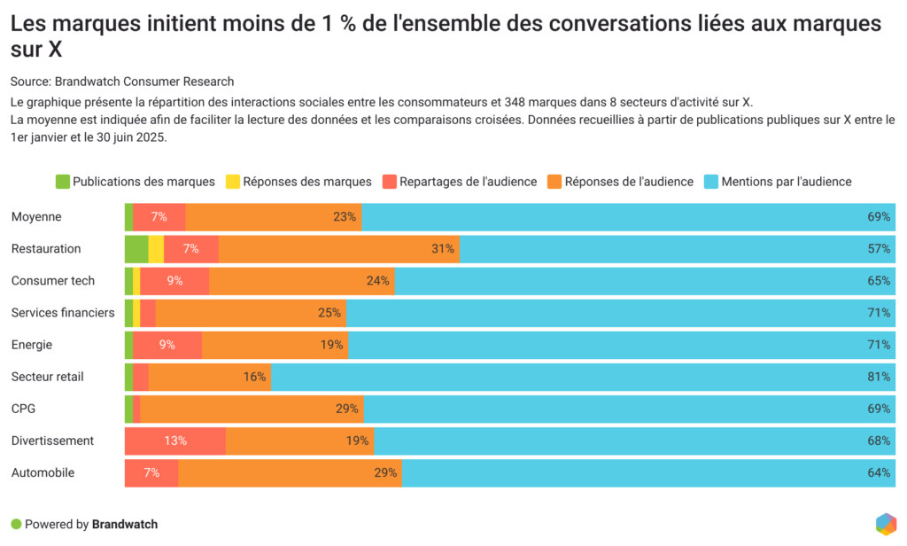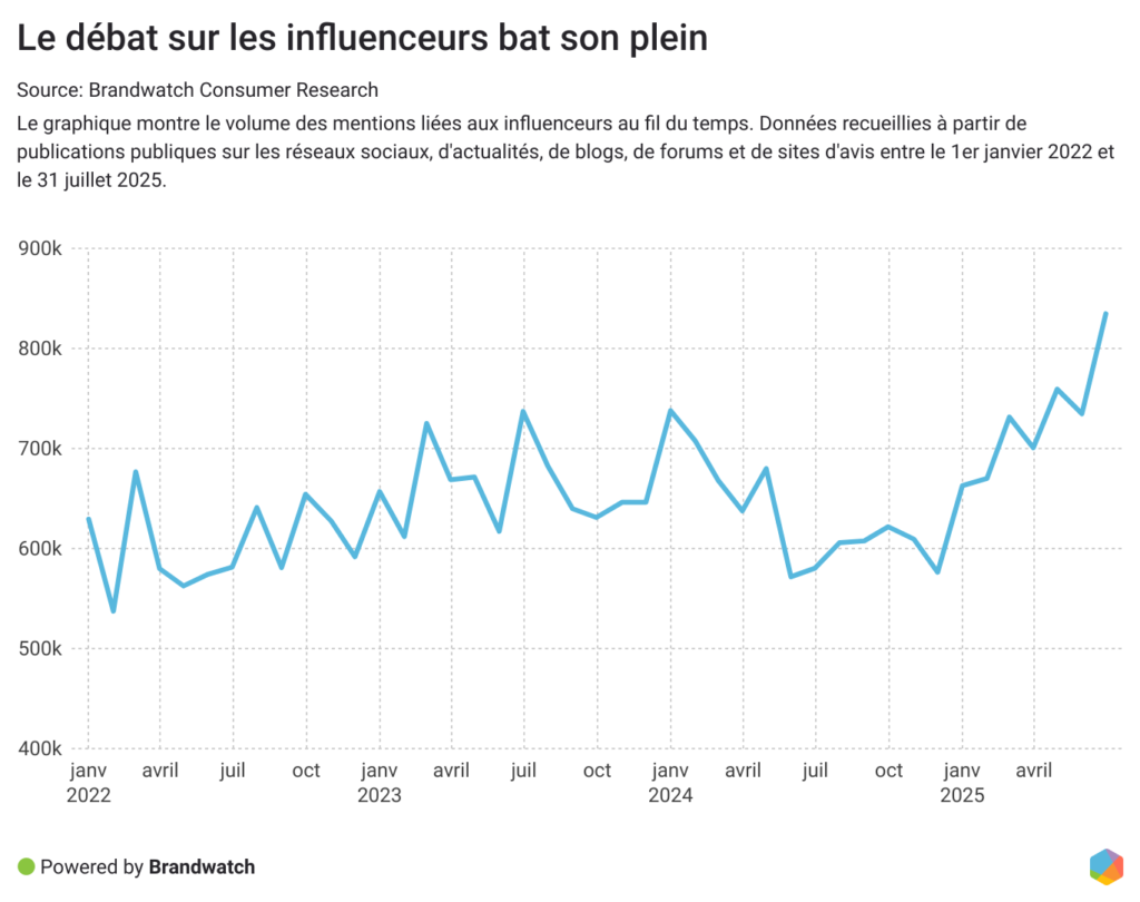 Ce rapport s’appuie sur les données de 910 millions de publications en ligne collectées avec Brandwatch Consumer Research entre le 1er janvier et le 30 juin 2025 (messages publics sur les réseaux sociaux, les forums, les blogs et les sites d’avis). Lorsque cela était pertinent, nous avons également analysé des données historiques remontant à janvier 2022 pour contextualiser et repérer les évolutions de fond. Sauf mention contraire, les comparaisons à la « période précédente » renvoient à la période allant du 1er juillet au 31 décembre 2024.