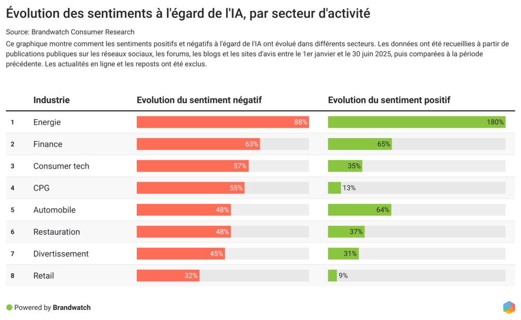 L’adoption de l’IA crée une anxiété chez les consommateurs concernant la confidentialité, la transformation des emplois et la perte de connexion humaine. Son adoption généralisée s’accompagne d’une surveillance accrue de ses performances et de son impact, et le débat se déroule sur les réseaux sociaux. Les préoccupations environnementales constituent un thème majeur. On note une augmentation de 32 % – par rapport aux six mois précédents – des mentions sur les enjeux énergétiques et climatiques liés à l’IA portant leur nombre à 30 000. Du côté positif, beaucoup considèrent l’IA comme un outil permettant d’améliorer la fiabilité des énergies renouvelables comme le solaire et l’éolien, de réduire les déchets, de diminuer les coûts ou d’accroître la résilience des systèmes. L’industrie automobile adopte également l’IA dans ses communications. Si l’innovation promettant de simplifier la vie des clients et d’augmenter leur sécurité sur les routes est généralement bien accueillie, des frustrations surgissent lorsque les systèmes d’IA prennent en charge l’inspection des retours de voitures de location, ou les robots du service client qui ne résolvent pas les problèmes réels.