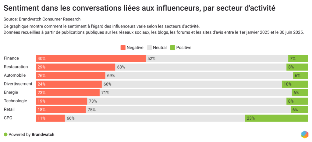 Les discussions sur les influenceurs liés à la finance sont les plus négatives (40% de tonalité négative). Les micro-influenceurs gagnent en popularité en tant que partenaires marketing efficaces dans ce secteur, les marques délaissant les recommandations de célébrités au profit de créateurs plus pertinents.
