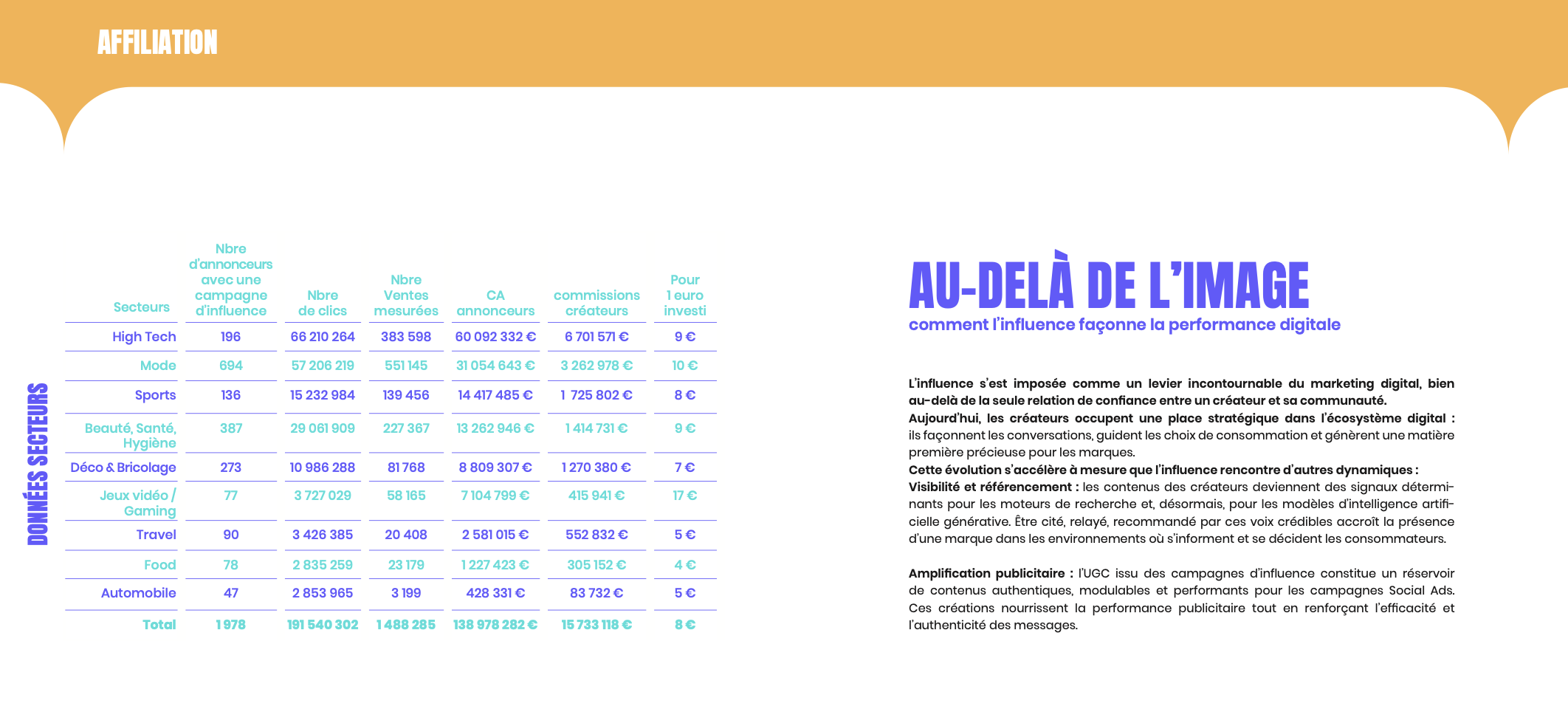 Le baromètre met également en avant la progression des dispositifs d’affiliation, qui rémunèrent les créateurs en fonction des ventes réalisées. Environ 2 000 annonceurs ont été actifs sur la période, pour un retour sur investissement moyen de neuf et un panier d’achat de 58 euros. Les annonceurs ont ainsi généré plus de 140 millions d’euros de chiffre d’affaires et versé plus de 15 millions d’euros de commissions aux créateurs.