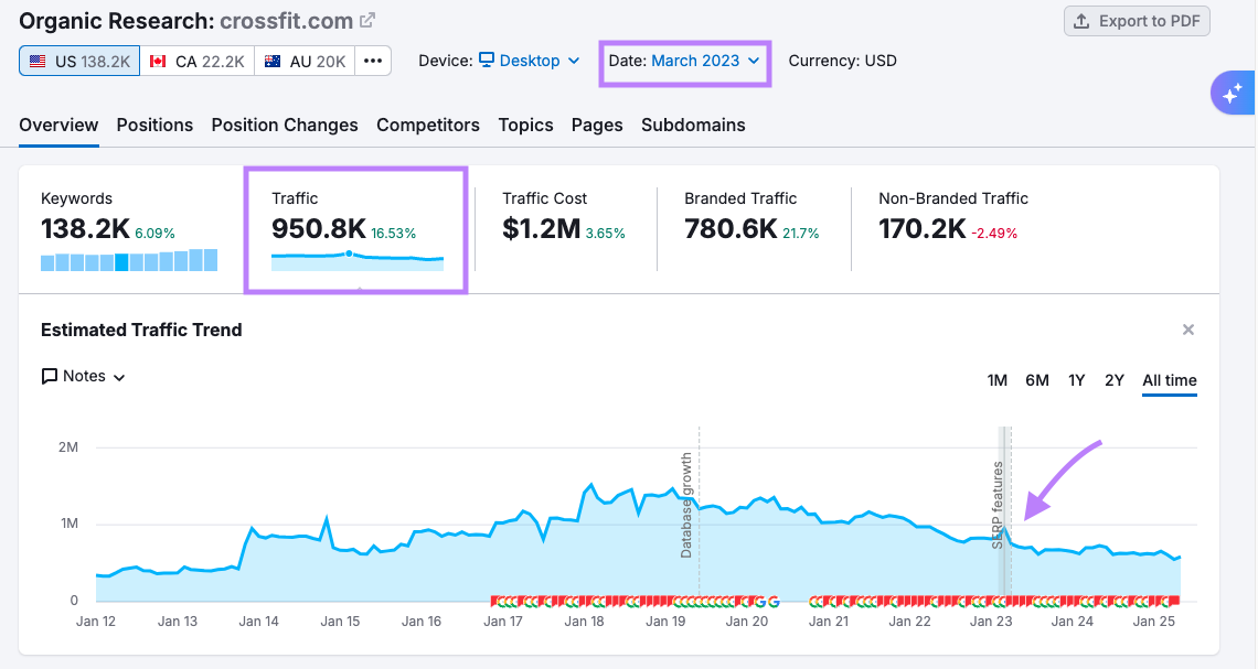 Accédez au rapport «Vue d’ensemble», cliquez sur l’onglet «Trafic» et sélectionnez les mois souhaités pour voir le trafic estimé au fil du temps. Vous pouvez ainsi déterminer précisément le moment où la baisse a commencé.