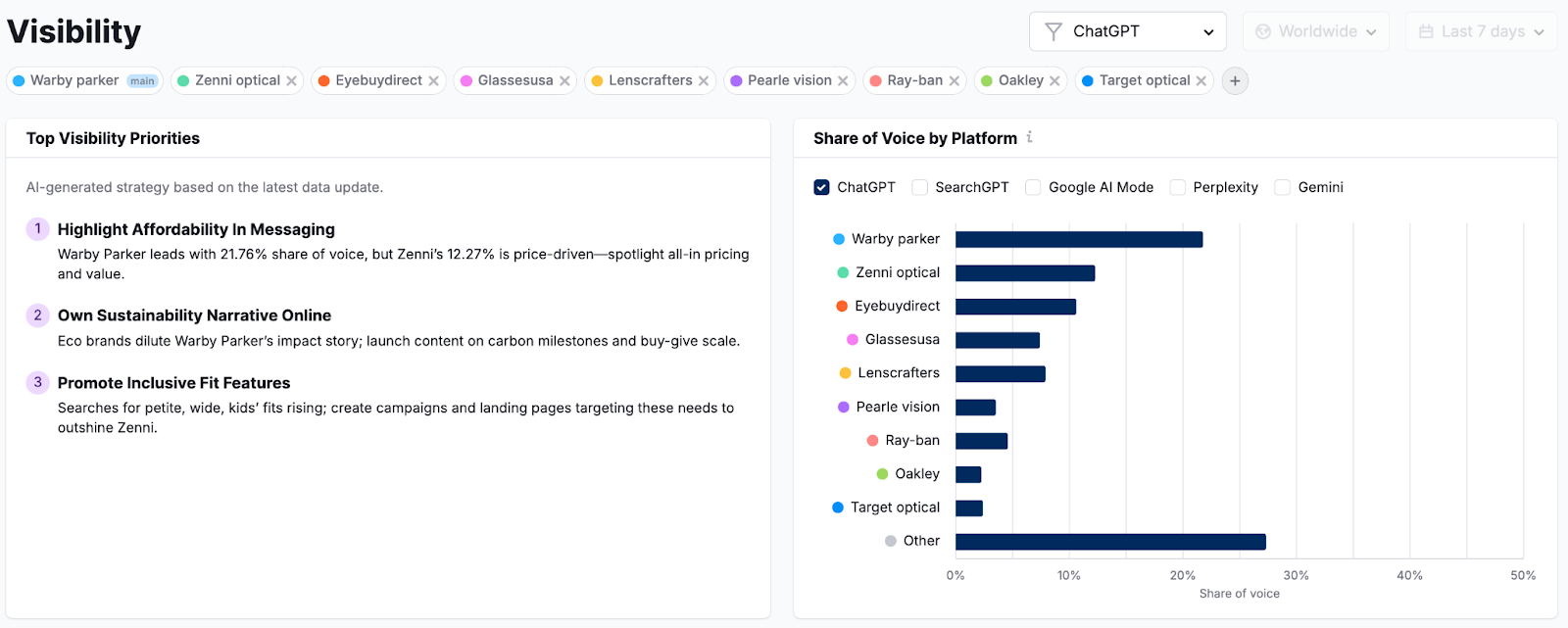 - Analyse comparative de la concurrence: Comparaison côte à côte de la visibilité et du sentiment pour identifier vos points forts et vos points faibles dans votre catégorie