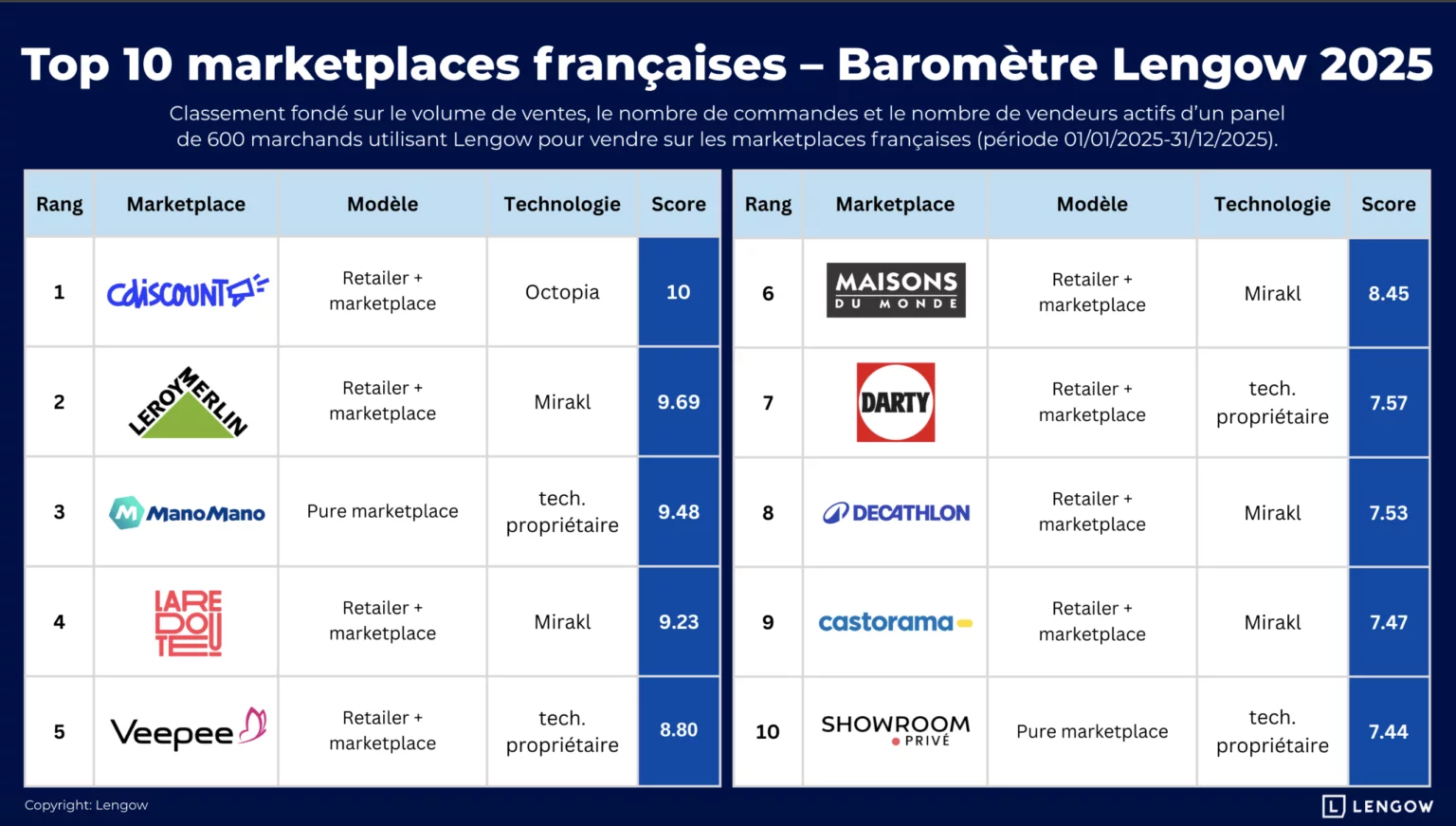 Le Baromètre Lengow 2025 confirme une spécificité forte du marché français : la domination des marketplaces portées par des retailers, et non par des pure players.