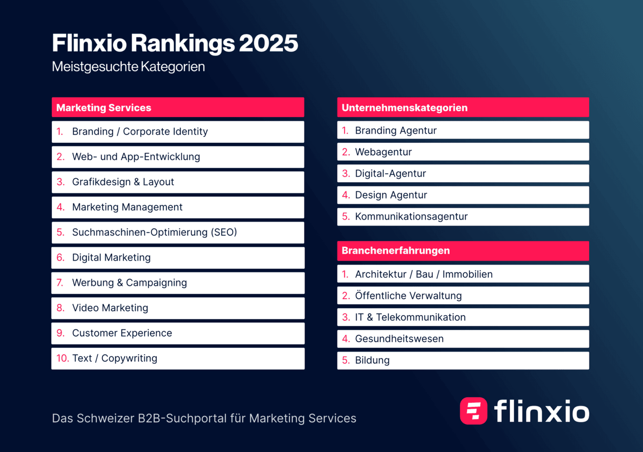 Depuis son lancement, Flinxio n’a cessé de gagner en importance sur le marché suisse du marketing et de la publicité en tant que portail de recherche. La présente analyse des services, catégories d’entreprises et expériences sectorielles les plus recherchés fournit pour la première fois un aperçu détaillé des tendances de recherche. Les classements 2025 se basent sur plus de 40’000 recherches sur www.flinxio.ch.