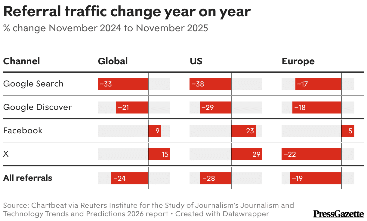 Les chiffres publiés dans le rapport Journalism and Technology Trends and Predictions 2026 s’appuient sur les données de Chartbeat, qui analyse le trafic de plus de 2 500 sites d’éditeurs à travers le monde. La tendance baissière n’est pas nouvelle, mais elle s’est considérablement accélérée. Depuis mai 2023, les referrals depuis la recherche Google ont reculé de 21 % globalement, tandis que l’ensemble des sources de trafic externes a diminué de 24 %.