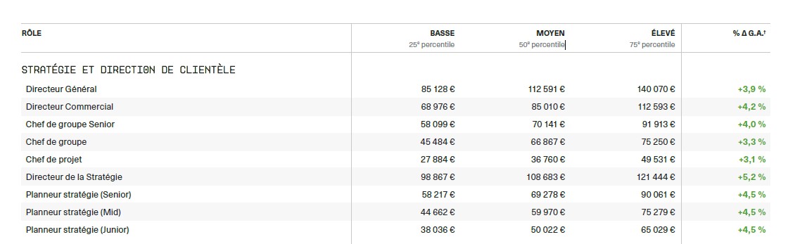 • Directeur de la stratégie : salaire médian de 108 683 € en moyenne, soit +5,2 % en un an.